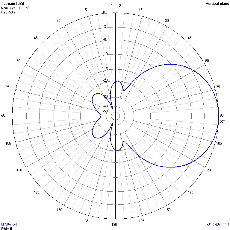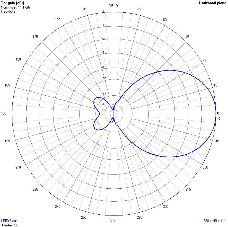 Here is a 7 element Loggi for the 6 meter Amateur band.  After a quick look at available large commercial 6 meter Yagis, I chose the M2 6M5XHP Yagi and Force-12 50 MHz OP-DES 6 element as my "standards" to compare to. The plots and specifications are shown below.