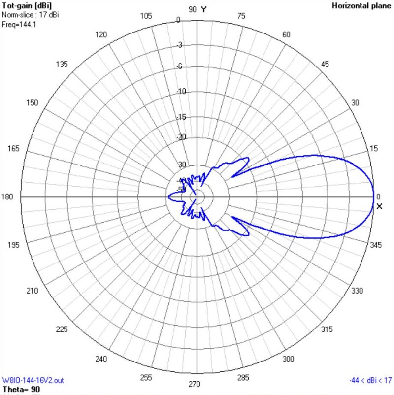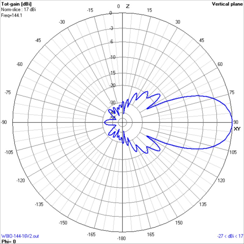 This particular antenna design was inspired by Hartmut DG7YBN and he was inspired by Günter DL6WU and Brian K6STI. His designs blend extremely high antenna gain, high G/T (which means a low noise temperature) along with a broad gain and VSWR bandwidth. The DE design is also very easy to build and allows adjustment of VSWR without significantly affecting the gain and pattern performance. A broad VSWR and gain bandwidth is ideally suited for wet and snow/ice climates where accumulation of moisture on the elements can lower the antennas resonant frequency and degrade performance. In this design, I have adjusted the spacing and element lengths slightly to increase the Front/Rear to values over 30 dB in each plane. The E-plane achieves an amazing 31.78 dB Front/Rear (all lobes from -90 to -180 degrees) at 144.1 MHz. This allows the antenna to reject terrestrial noise sources to an extremely high degree for improved EME performance in noisy locations. Element diameters are common US sizes (1/4" and DE 3/8").