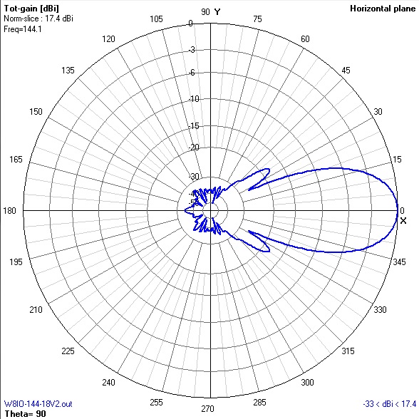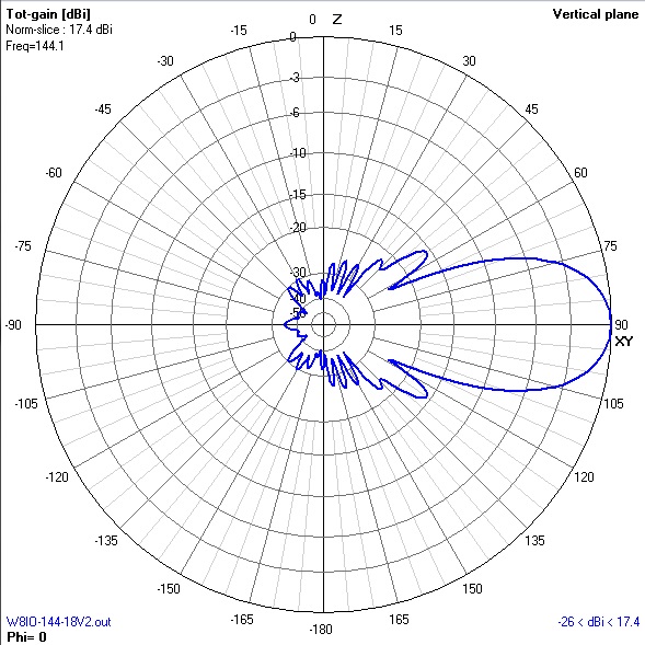 This particular antenna design was inspired by Hartmut DG7YBN and he was inspired by Günter DL6WU and Brian K6STI. His designs blend extremely high antenna gain, high G/T (which means a low noise temperature) along with a broad gain and VSWR bandwidth. The DE design is also very easy to build and allows adjustment of VSWR without significantly affecting the gain and pattern performance. A broad VSWR and gain bandwidth is ideally suited for wet and snow/ice climates where accumulation of moisture on the elements can lower the antennas resonant frequency and degrade performance. In this design, I have adjusted the spacing and element lengths slightly to increase the Front/Rear to values over 30 dB in each plane. The E-plane achieves an amazing 34.08 dB Front/Rear (all lobes from -90 to -180 degrees) at 144.1 MHz. This allows the antenna to reject terrestrial noise sources to an extremely high degree for improved EME performance in noisy locations. Element diameters are common US sizes (1/4" and 3/16").