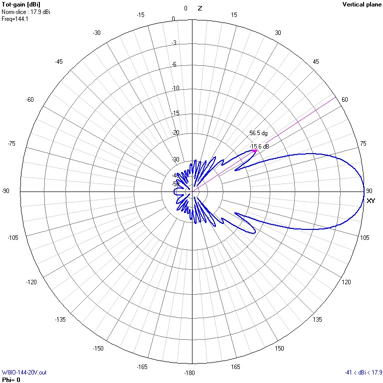 This particular antenna design was inspired by Hartmut DG7YBN and he was inspired by Günter DL6WU and Brian K6STI. His designs blend extremely high antenna gain, high G/T (which means a low noise temperature) along with a broad gain and VSWR bandwidth. The DE design is also very easy to build and allows adjustment of VSWR without significantly affecting the gain and pattern performance. A broad VSWR and gain bandwidth is ideally suited for wet and snow/ice climates where accumulation of moisture on the elements can lower the antennas resonant frequency and degrade performance. In this design, I have adjusted the spacing and element lengths slightly to increase the Front/Rear to values over 30 dB in each plane. The E-plane achieves an amazing 37.04 dB Front/Rear (all lobes from -90 to -180 degrees) at 144.1 MHz. This allows the antenna to reject terrestrial noise sources to an extremely high degree for improved EME performance in noisy locations. Element diameters are common US sizes (1/4" and 3/16").